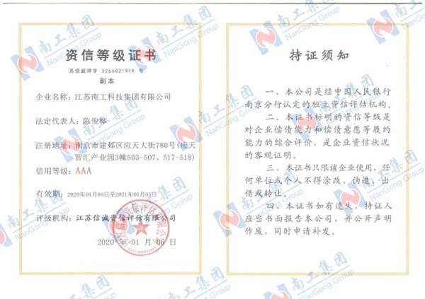 您的位置:集团首页 >> 走进南工 >> 企业荣誉 >> 企业荣誉 >> AAA资信等级证书